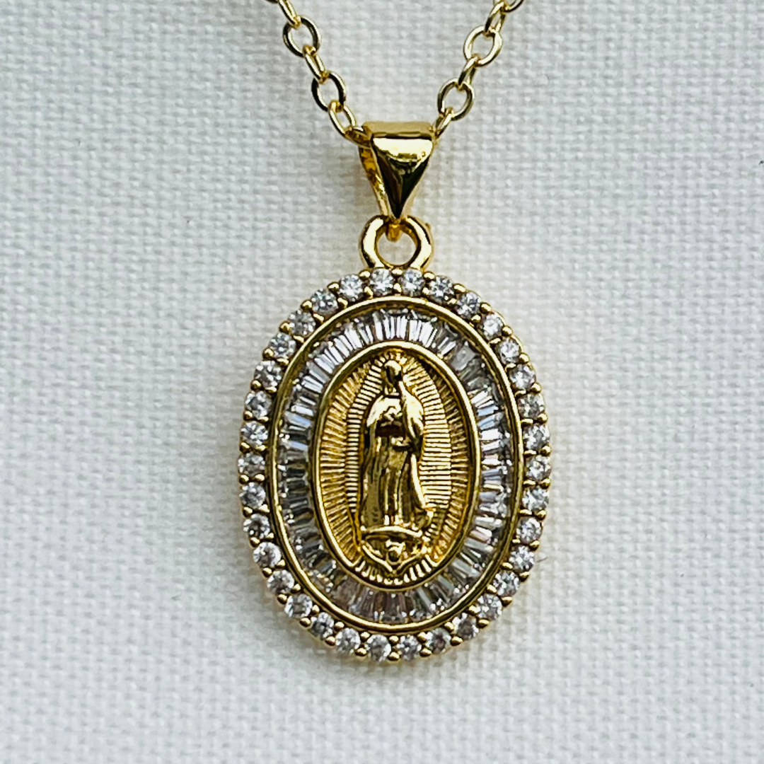 This stunning gold stack of layered necklaces is all about the intricate details of the Blessed Virgin Mary and the beautiful gold accents that make this combination an absolute bestseller!!